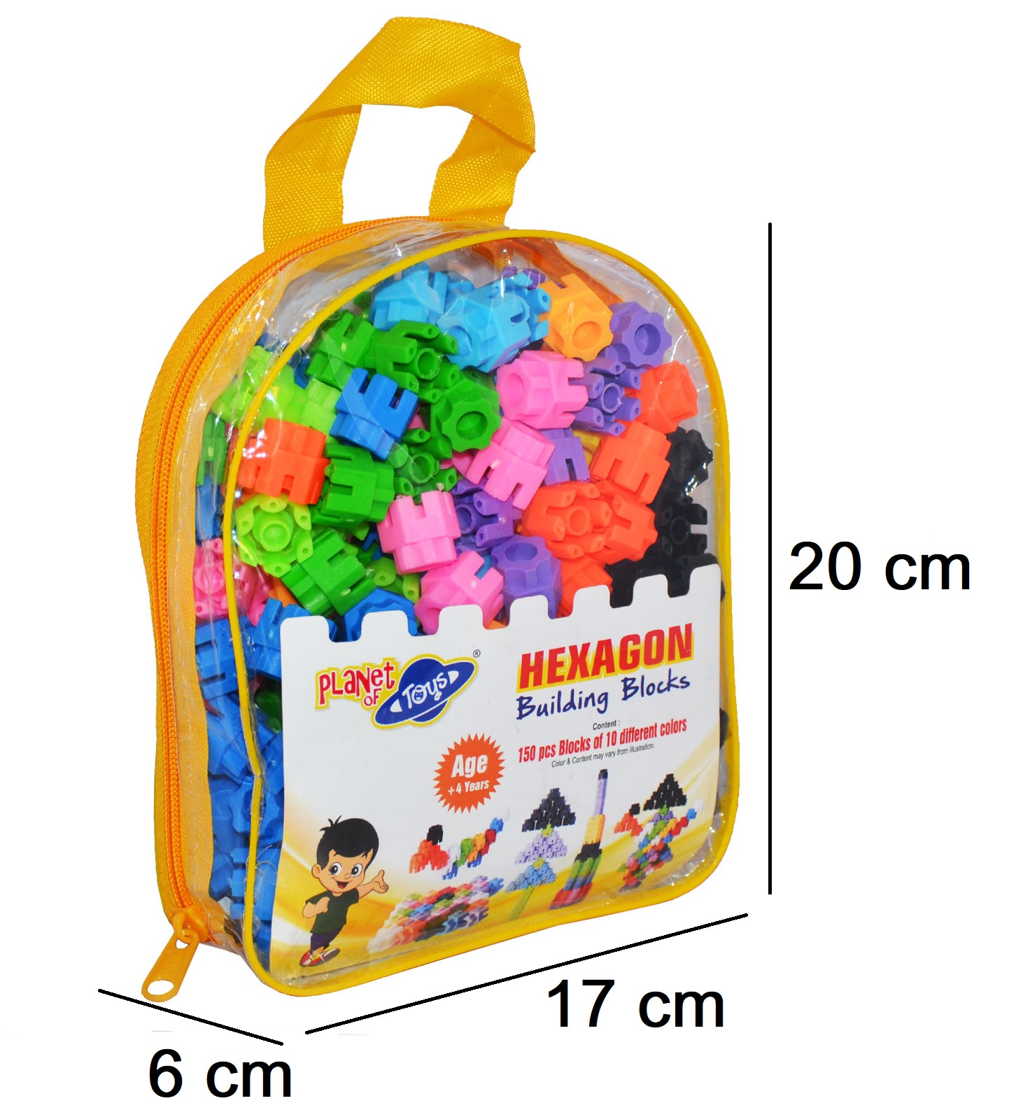 Planet of toys brings the early learning hexagon building blocks to stimulate and enhance problem-solving, imagination, self-expression, mathematics, continuity and permanence, creativity. Blocks help children learn to take turns and share materials, develop new friendships, become self-reliant, increase attention span, cooperate with others, and develop self-esteem.